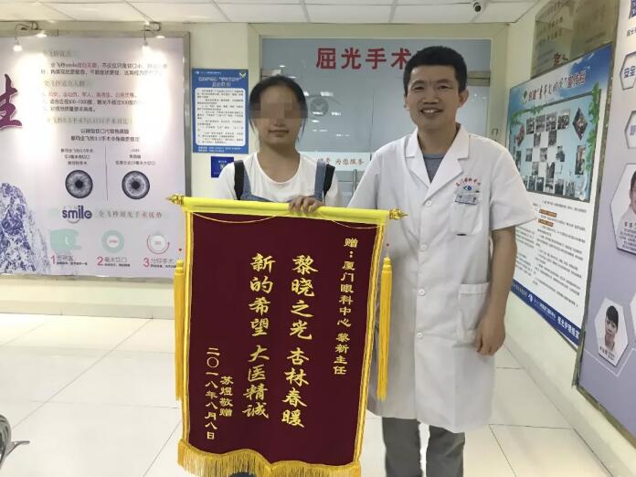 “克服內(nèi)心的恐懼不容易,幸好有黎新主任耐心引導(dǎo),讓我擺脫內(nèi)心的恐懼,成功摘鏡眼鏡,我非常非常感謝黎新主任。”雙眼視力已矯正到1.2的小蘇懷著無比激動的心情說。為了表達自己的感激之情,她還特意給黎主任寫了詩、感謝信、贈送錦旗。