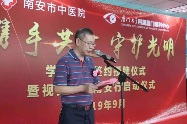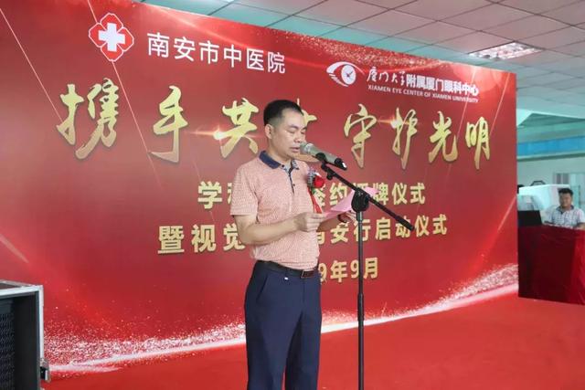 南安市衛(wèi)健局副局長林清楚、南安市中醫(yī)院院長陳春雷、黨支部書記洪清華、廈門大學(xué)附屬廈門眼科中心業(yè)務(wù)院長侯家敏教授、廈門大學(xué)附屬廈門眼科中心業(yè)務(wù)副院長陳燕、廈門大學(xué)附屬廈門眼科中心執(zhí)行總經(jīng)理姚鄭玲玲、廈門大學(xué)附屬廈門眼科中心泉州區(qū)域品牌總監(jiān)周志鑫等領(lǐng)導(dǎo)、專家出席了儀式。活動由洪清華書記主持。