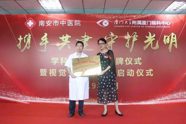 簽約儀式后,廈門大學(xué)附屬廈門眼科中心業(yè)務(wù)副院長陳燕代表廈門眼科中心把“學(xué)科共建”牌匾授予南安市中醫(yī)院,南安市中醫(yī)院五官科主任洪培華上臺代表醫(yī)院接受了牌匾。