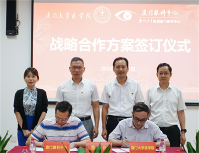 7月31日下午,廈門大學(xué)附屬?gòu)B門眼科中心與廈門大學(xué)醫(yī)學(xué)院在廈門大學(xué)翔安校區(qū)舉行戰(zhàn)略合作方案簽訂儀式,雙方簽署戰(zhàn)略合作協(xié)議并進(jìn)一步深化醫(yī)療、教學(xué)和科研領(lǐng)域的合作。廈門眼科中心董事長(zhǎng)蘇慶燦,中國(guó)科學(xué)院院士、廈門大學(xué)醫(yī)學(xué)院院長(zhǎng)韓家淮代表雙方進(jìn)行簽約。