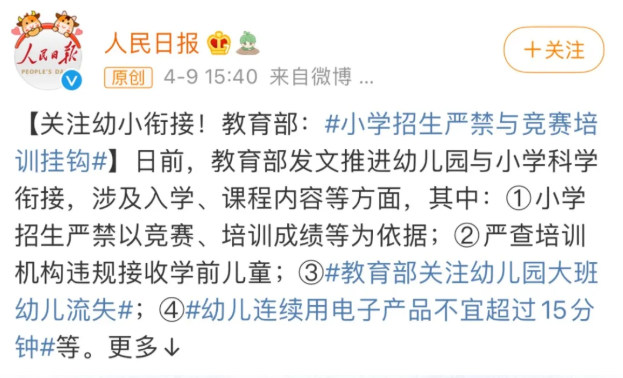 近日,人民日報微博發(fā)布了教育部發(fā)文推進幼兒園與小學科學銜接,涉及入學、課程內容等方面。①小學嚴格執(zhí)行面試就近入學;②幼兒園不得提前教授小學課程內容;③幼兒園不得布置讀寫算家庭作業(yè)……其文中特別提出:幼兒連續(xù)使用電子產(chǎn)品應不超過15分鐘,兒童單次使用電子產(chǎn)品時間不宜超過15分鐘,每天累計不宜超過1小時。保證幼兒每天的戶外游戲和體育活動時間。